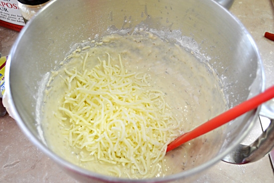- Add eggs and 1 cup flour; beat 2 minutes at high speed. Stir in 1 cup cheese and remaining flour to make a stiff batter.