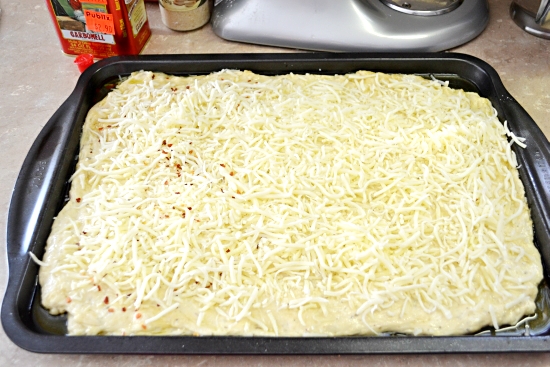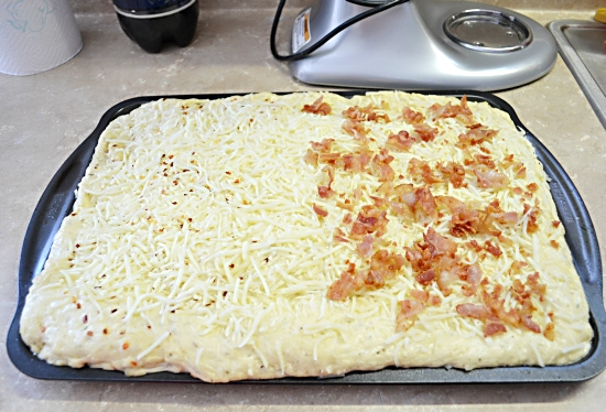 - Spread batter on greased 15 x 10-inch jelly roll pan or rimmed baking sheet with at least 1-inch sides. Sprinkle with remaining cheese; top with bacon.