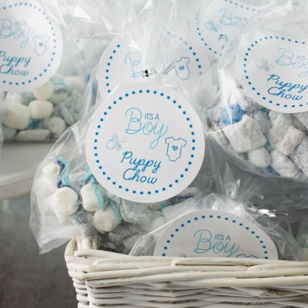 - Cute "It's a Boy Puppy Chow" design with baby pacifier and onesie icons.